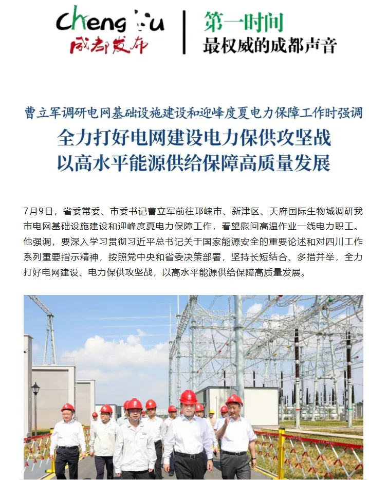 成都發(fā)布:曹立軍調(diào)研電網(wǎng)基礎(chǔ)設(shè)施建設(shè)和迎峰度夏電力保障工作